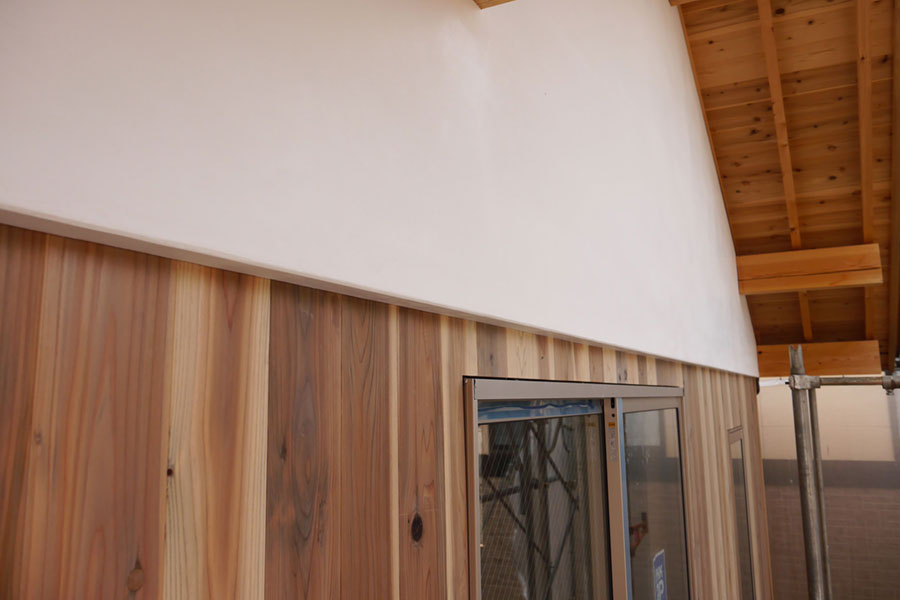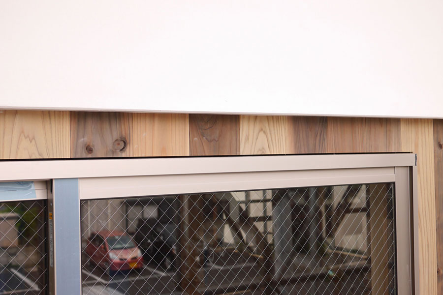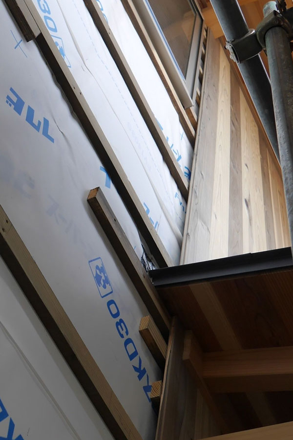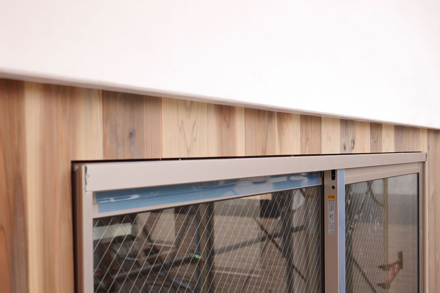 本漆喰の妻壁とサッシの間の細い部分。きれいに板が張られています。
