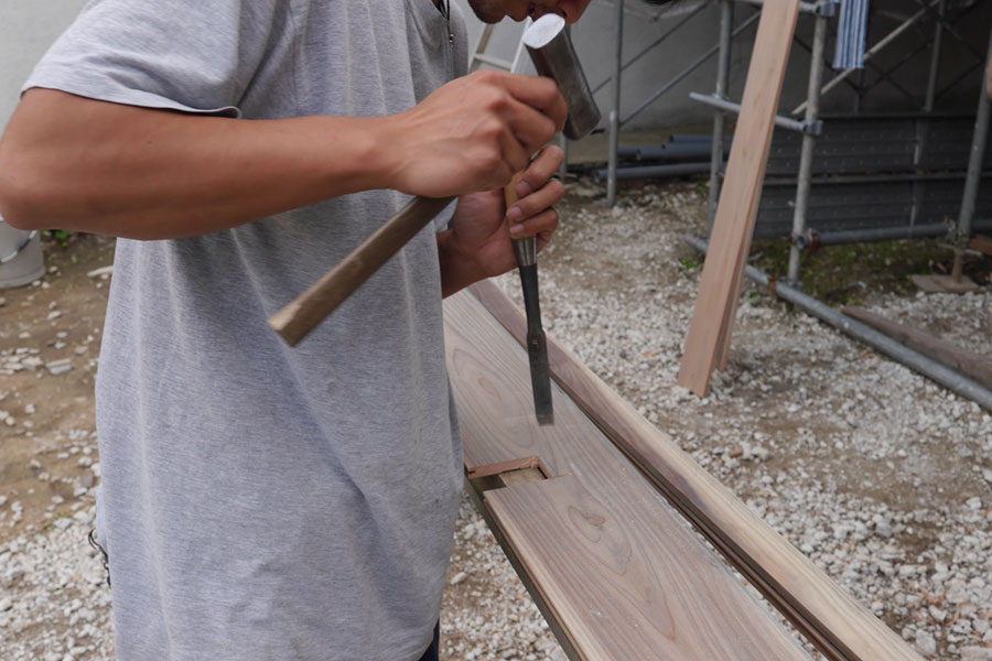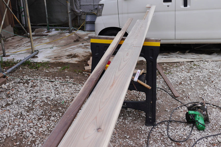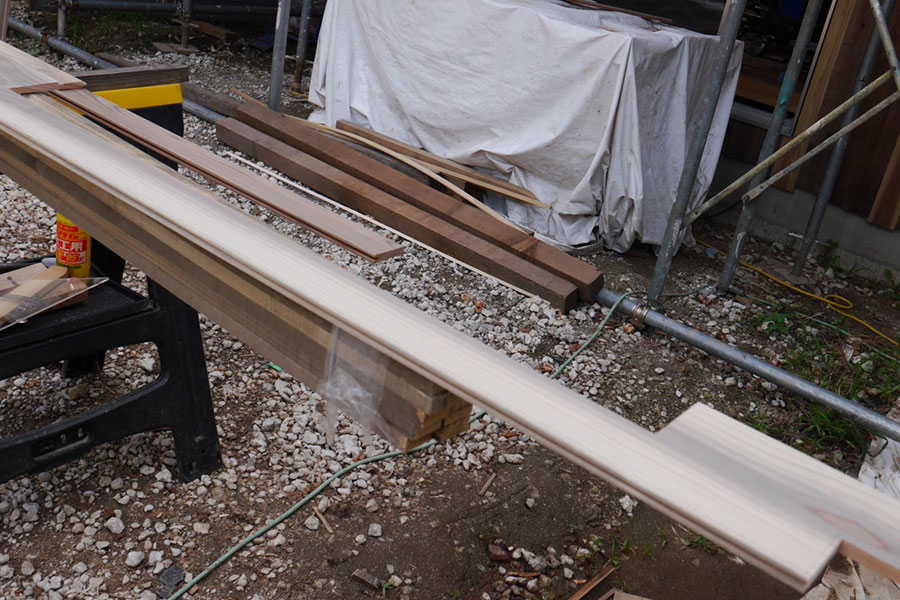 刻んでる最中の板。面倒な所は一枚一枚こうして現場で刻んでました。横の細い棒は長さを割り出すのに使った定規です。