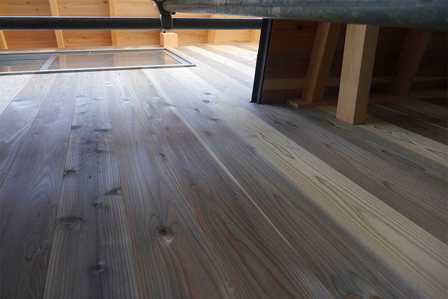 サッシと妻壁の間が狭く、「誰が設計したんだぁ!」と棟梁がぼやいてるので、詳しく聞くと、こういった細かいところは棟梁自身だそうです。だからぼやいてたんですね。(^.^;