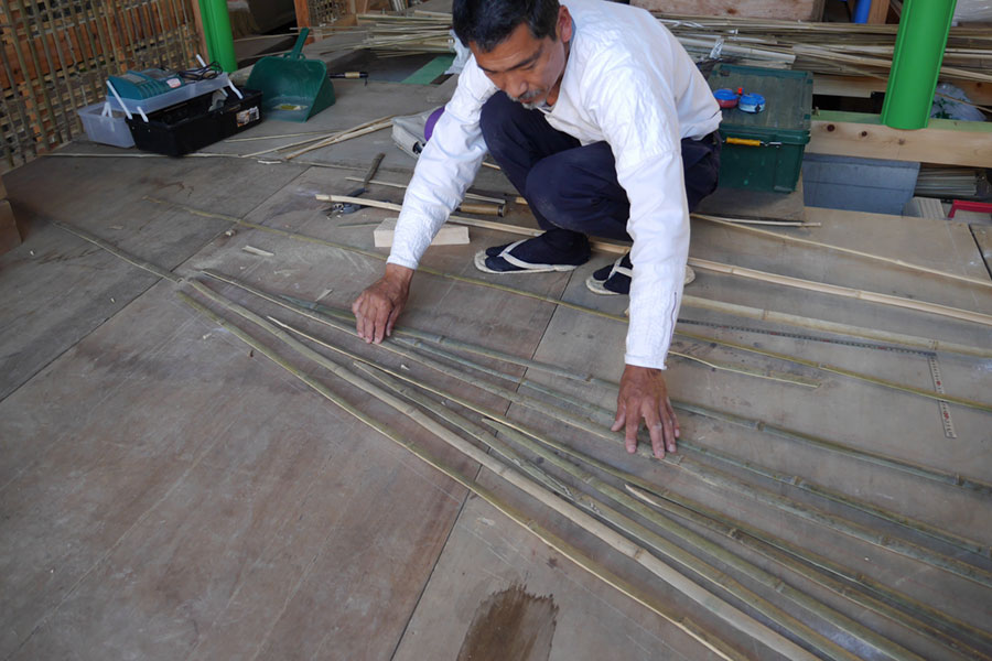 江原さんが壁の長さに合わせて竹を切断