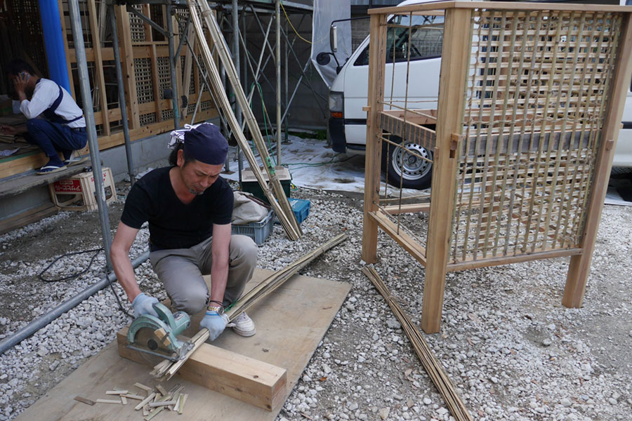 いよいよ小舞編みワークショップ開催。ということで、前日の準備をレポート。 大工作業の忙しい中、明日のためにみなさんで準備くださっています。ありがとうございます。