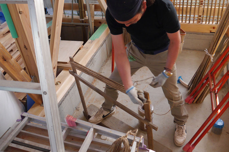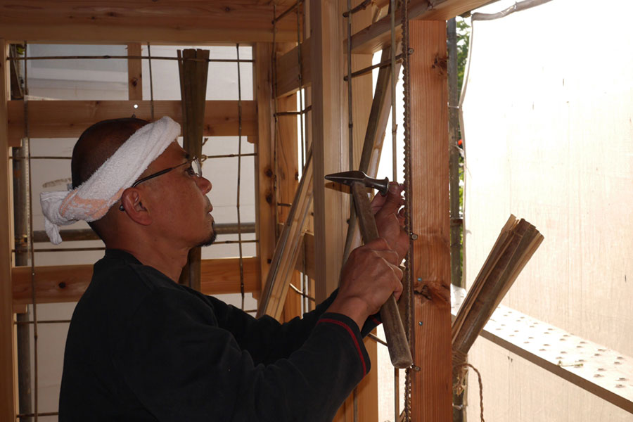 大工の中尾さん、今日は左官仕事の小舞のセッティング