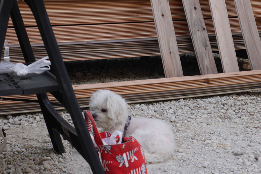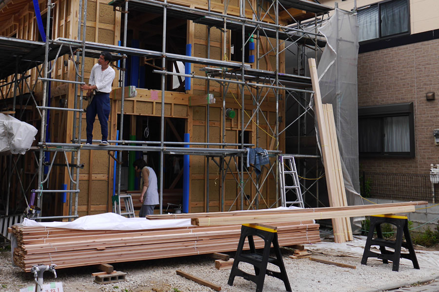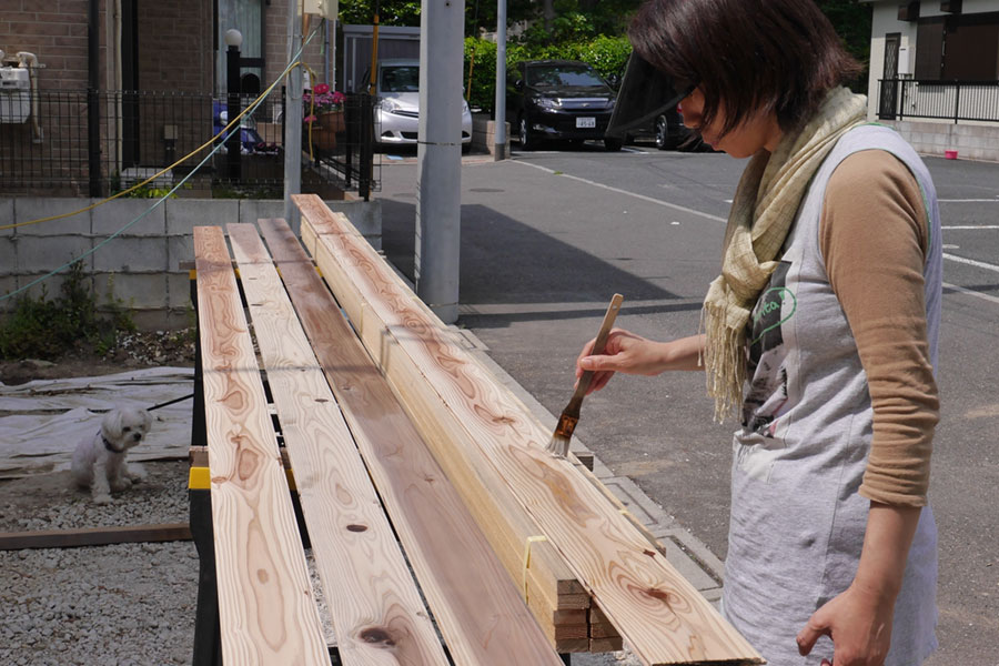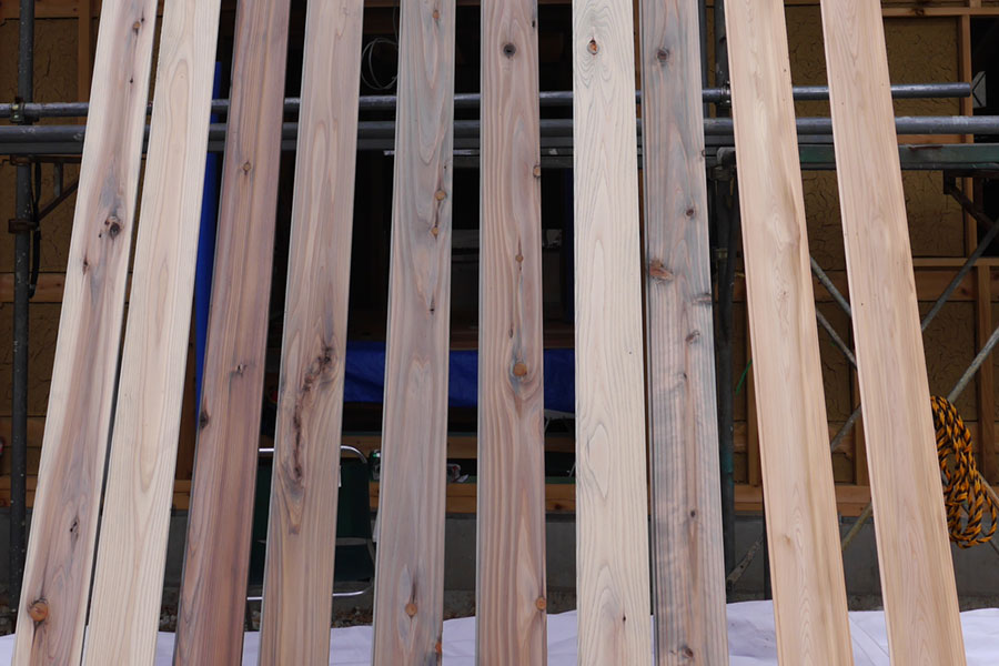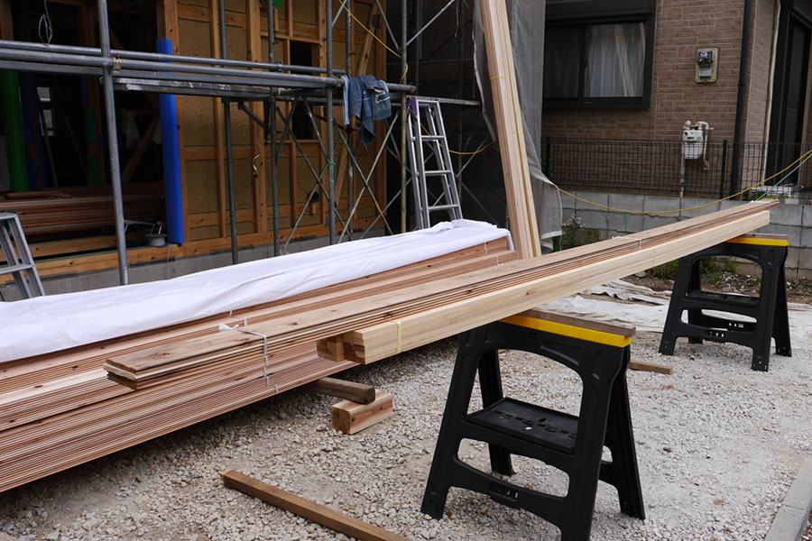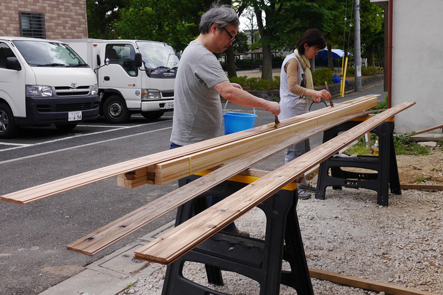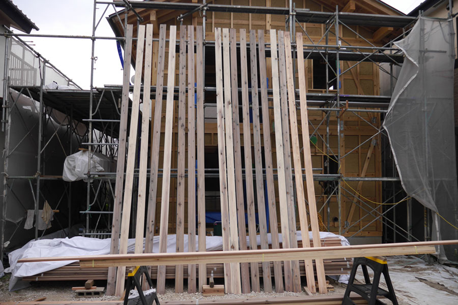 実は、今回のレポートは梅雨入り前にやっていた作業です。外壁工事にあわせてアップする予定でしたが、雨で外壁工事は延期。雨が上がったら保護剤を塗った壁板は一挙に張れるようにと、大工の良治さんが屋内でカット中。雨がやむと外壁に張り付ける予定です。