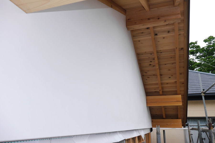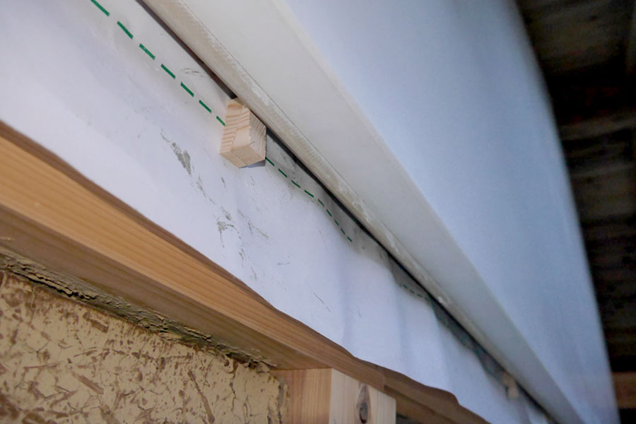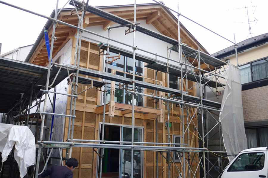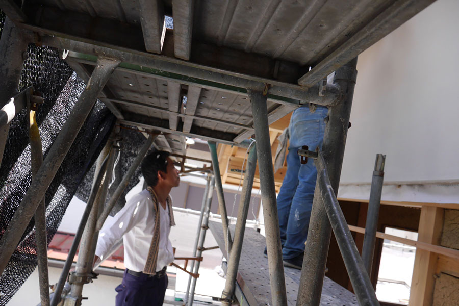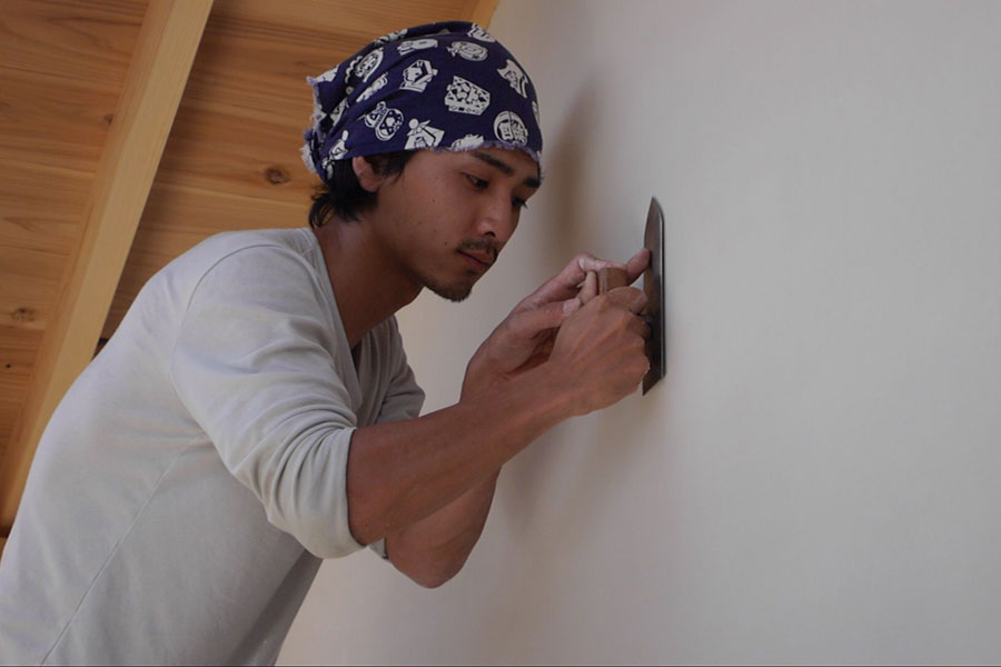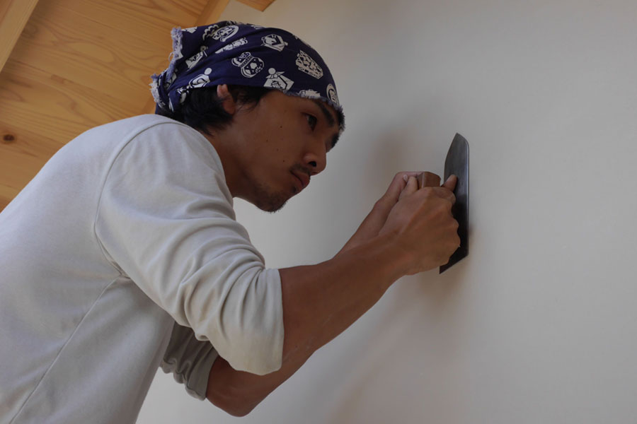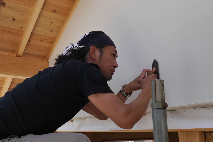 左官仕上げの妻壁『本漆喰硬押え一分五厘面尾垂れ』 【伝統建築現場レポート】本漆喰の妻壁④ 2014年5月30日 2014年6月12日 ton-tan 22世紀の古民家を造る, 我家の家造りレポート 数日後に乾いてきた、美しい仕上がりの妻壁。我が家の自慢の一つです。 Tweet いよいよ本漆喰硬押え一分五厘尾垂れの妻壁が完成!写真でも真っ白な漆喰壁がとてもきれいですが、足場で近くから見ると人の手でこんなに白くて真っ平らで均質な壁が造れるのって、すごすぎです。 本漆喰で塗り上がった妻壁 硬押え中の江原さん 一分五厘って、この角 ↑ 尾垂れは板を差し込む作り 鏝と壁を見つめながらしっかり押えてます。 独立最初の仕事がこの妻壁。これから頑張ってね! いつもと違って職人さんの仕事を見守ってる都倉棟梁。父ですね。 数日後に乾いてきた、美しい仕上がりの妻壁。我が家の自慢の一つです。 妻壁の仕上がった、現場。白さが美しいです。 次ページから詳細説明 1 2 Tweet 関連 伝統構法家左官建てる木造漆喰