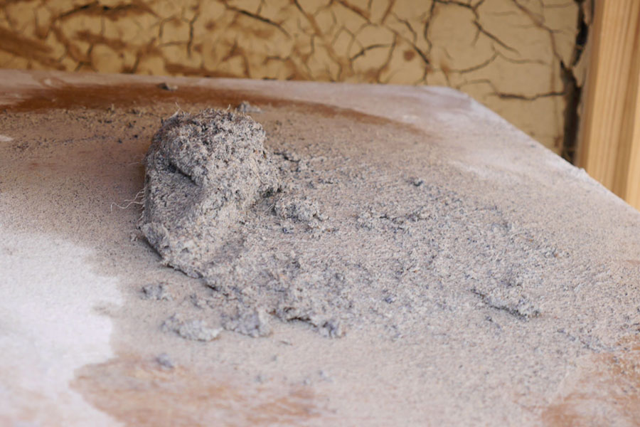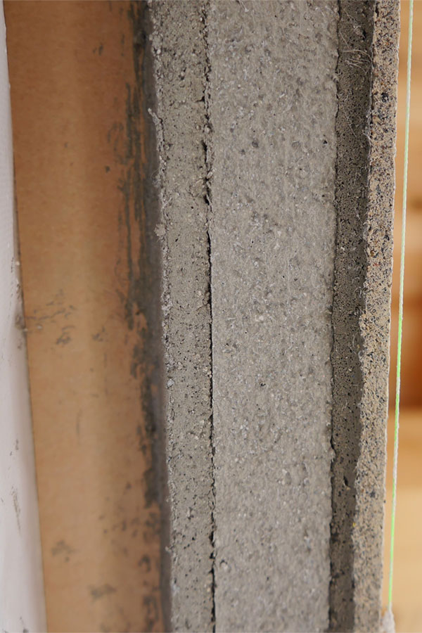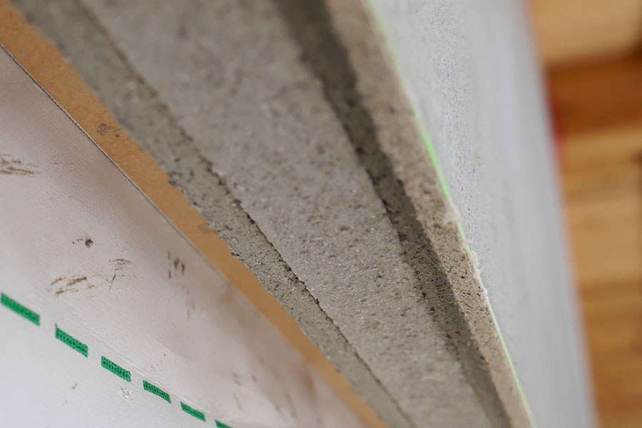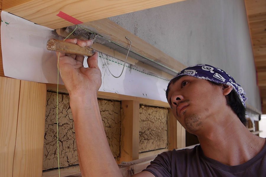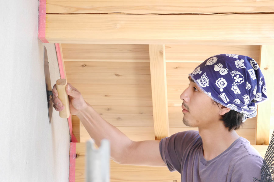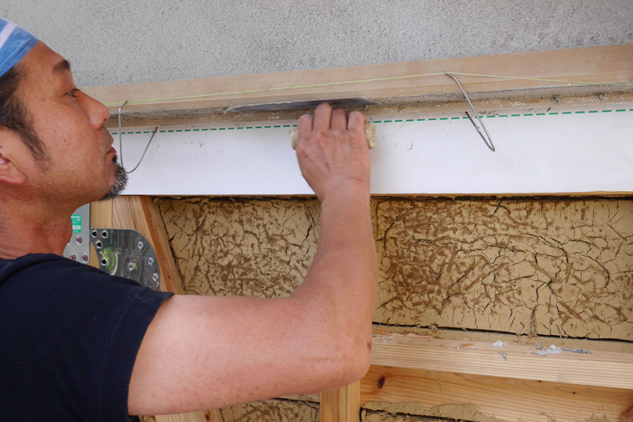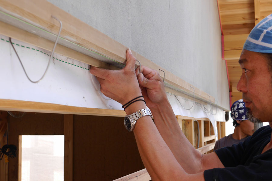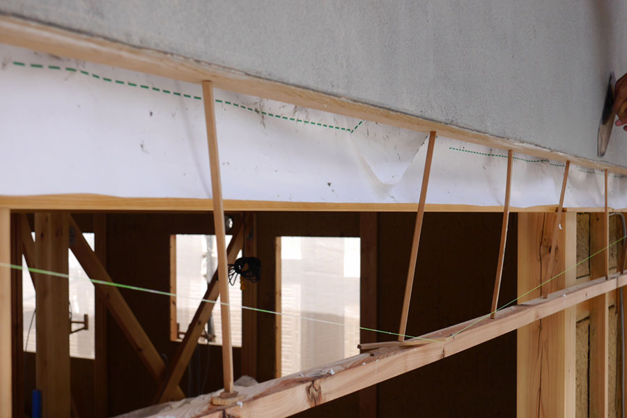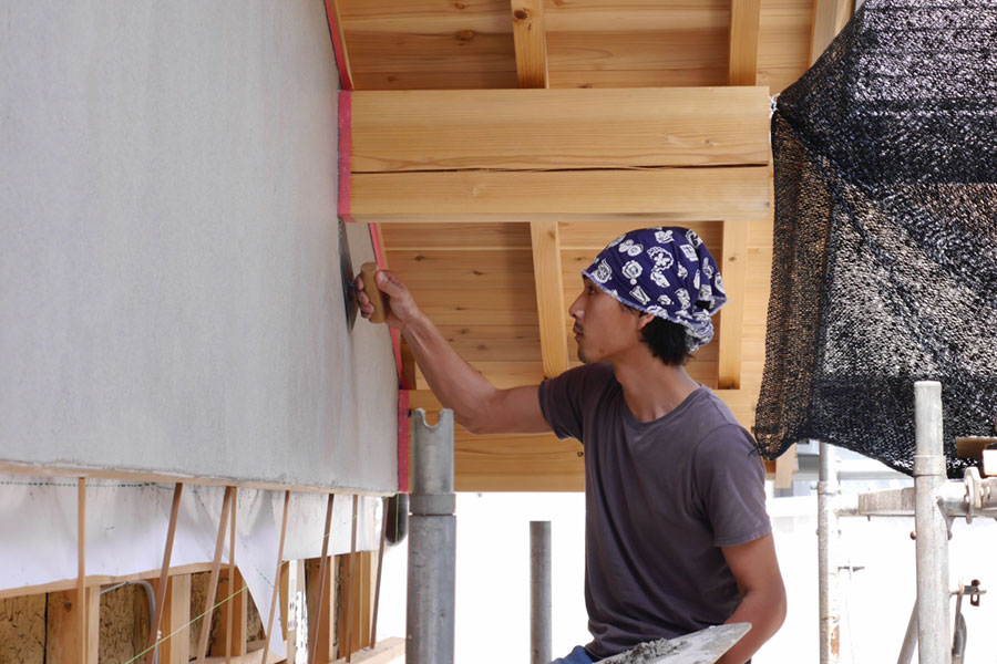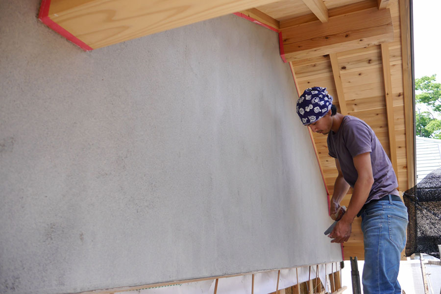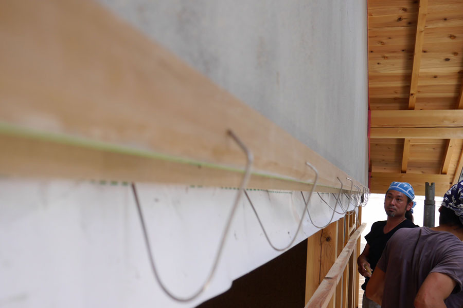 妻壁もいよい中塗り、次は上塗り、本漆喰硬押えです。 妻壁を塗っている間、私たちも壁板の保護剤塗りがあったので、ほとんど毎日現場に出かけていましたが、仕事の都合でお昼前に下塗りのモルタルの写真を撮るつもりで現場に到着したら、すでに中塗りの砂漆喰がほとんど塗り終わっていました。 左官仕事って朝早くからやってるので、お昼前にはずいぶん進んでいるものです。夜中に仕事してる我が家の時間で現場に行くと見逃す工程がたくさん。夕方までにちゃんと仕事が終わるよう、乾く時間を計算に入れているので、とても手早い仕事です。