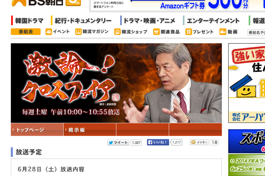 BS朝日で毎週土曜日にやっている「激論クロスファイア」という番組。世の中がどんどん変な方向に向かってるなか、政治家たちは何を考えているんだろうか、そういう疑問を突きつけている番組の一つ。ジャーナリストの田原総一朗さんが毎回政治家やゲストを呼んで鋭い切り口で迫るこの対談番組が私は好きなんです。