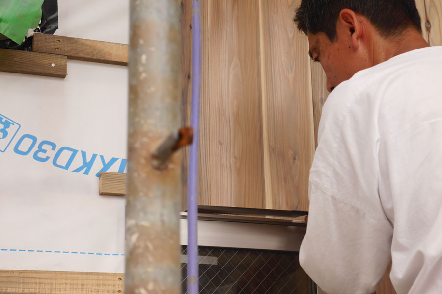 妻壁の壁板の厚み+1mmぐらいの隙間に一枚一枚杉の壁板を挟んで、前に張った板の本実に差し込んでは釘でとめていきます。