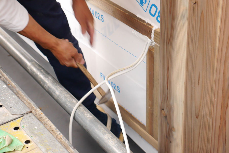 サッシと妻壁の間が狭く、「誰が設計したんだぁ!」と棟梁がぼやいてるので、詳しく聞くと、こういった細かいところは棟梁自身だそうです。だからぼやいてたんですね。(^.^;