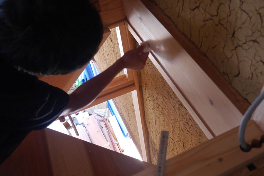 この部分、2階の梁に溝を彫って差し込むのですが、組み易さを優先すると、溝と材木の隙間が広がるので、大工の腕の見せ所です。良治さんは本当に丁寧な仕事で隙間無くピッタリに差し込みました。
