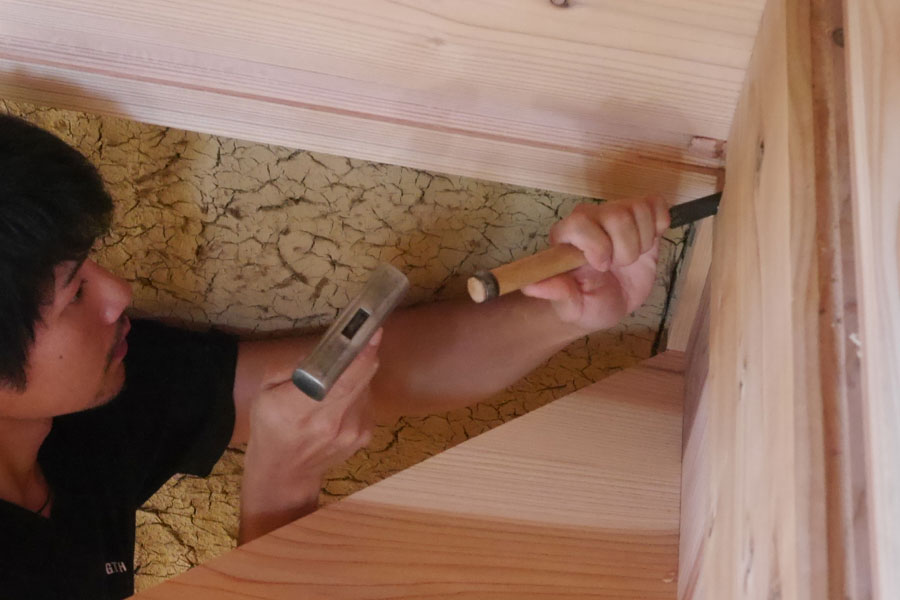 これが今回一番注目の最上段の踏み板。三角形です。玄翁でトントンしているのは入れる溝より少し厚めの板にしている為です。入ってから広がるようにどんな所でもこうして端を叩いてから差し込んでいます。