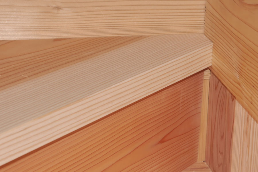 こうして出来上がった三角の踏み板。溝に差し込まれた所がピッタリ収まり、隙がありません。隙があったり、あとで埋めたりするのであれば、簡単なのです。