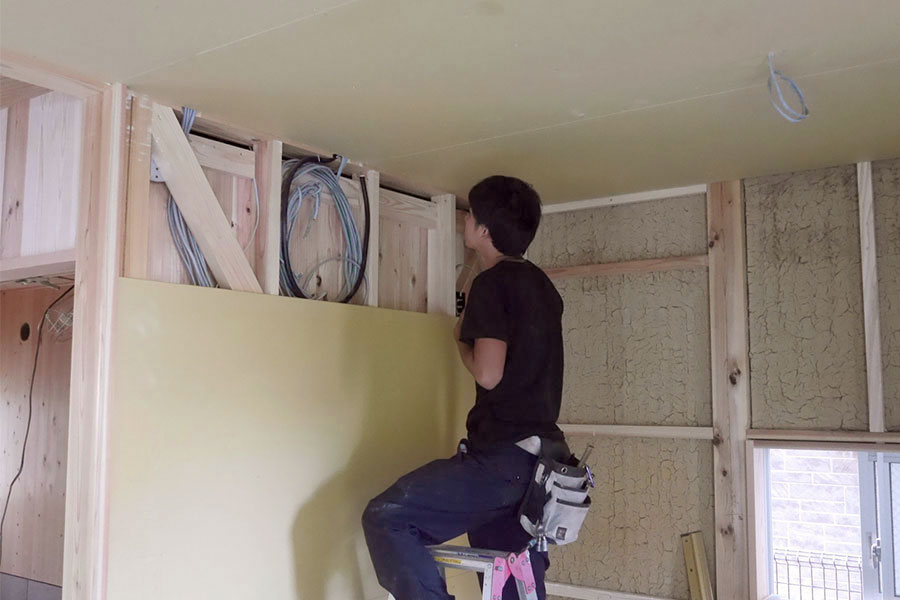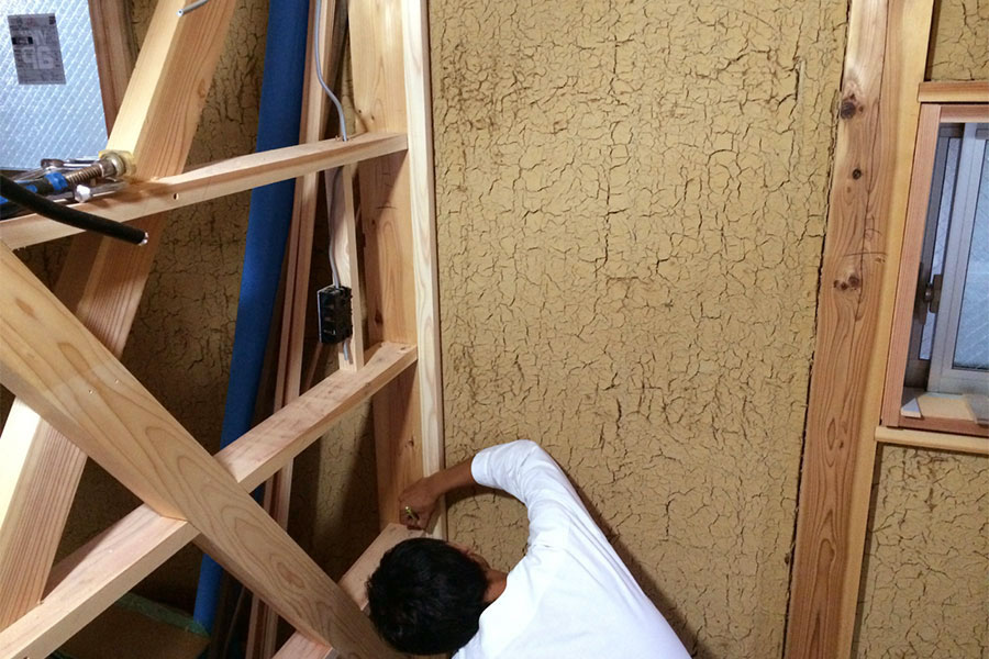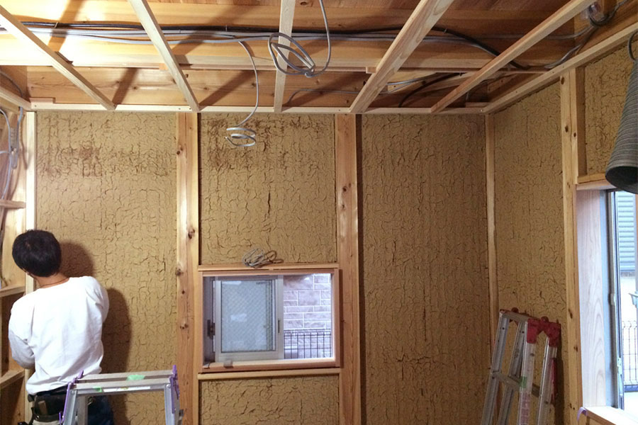本来、土壁にも4寸角の杉の柱にも十分な燃えしろがあると思われるのですが、現在の法律では不燃材の石膏ボードを張らなければならないのです。防災上の必要は分かるのですが、せっかくほとんどすべての素材が地球い優しい自然素材で作られた家なので残念です。