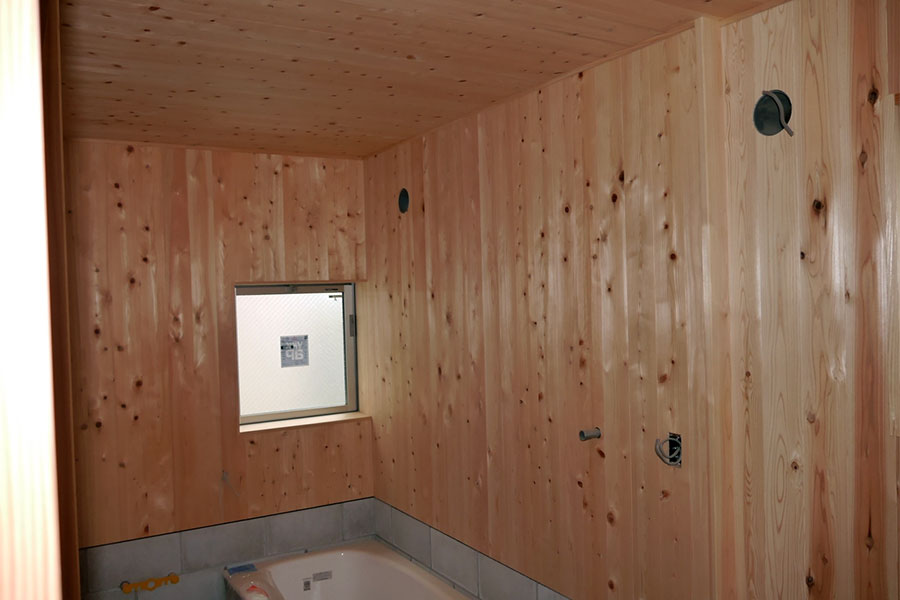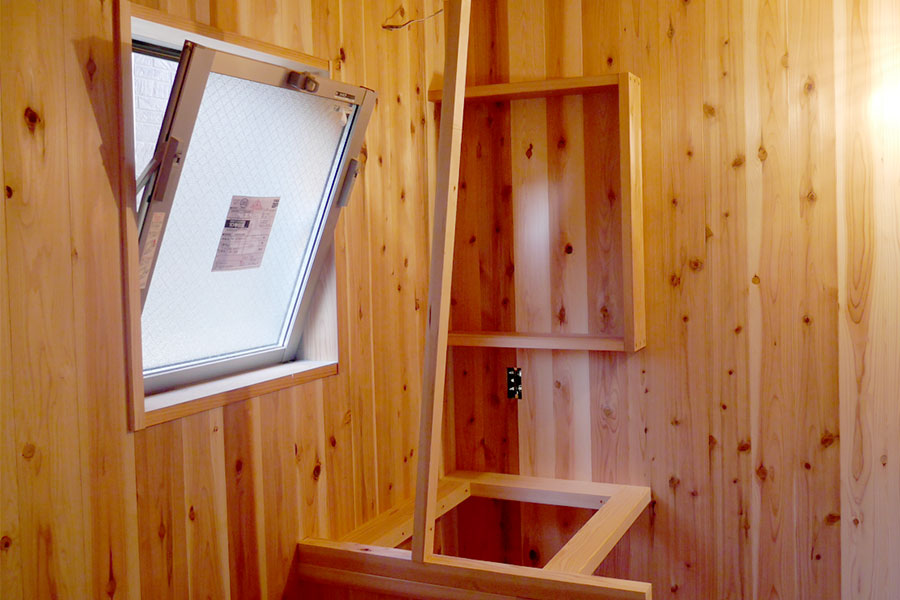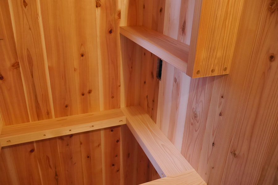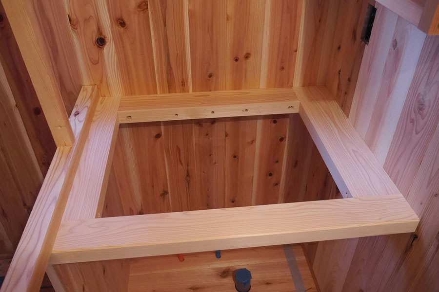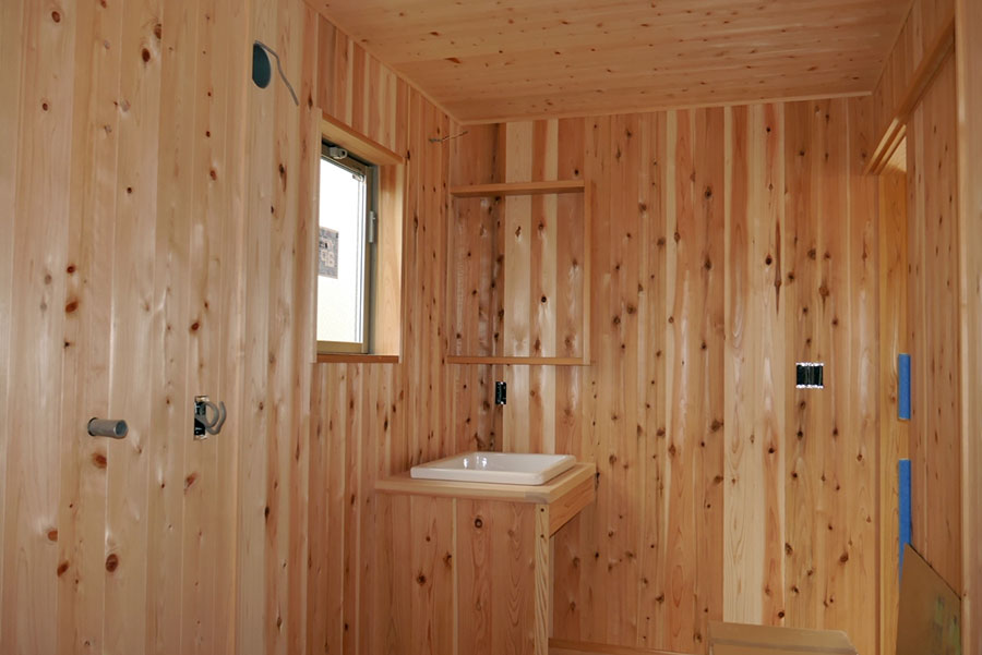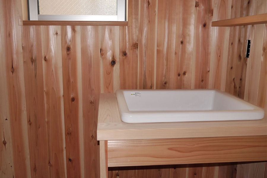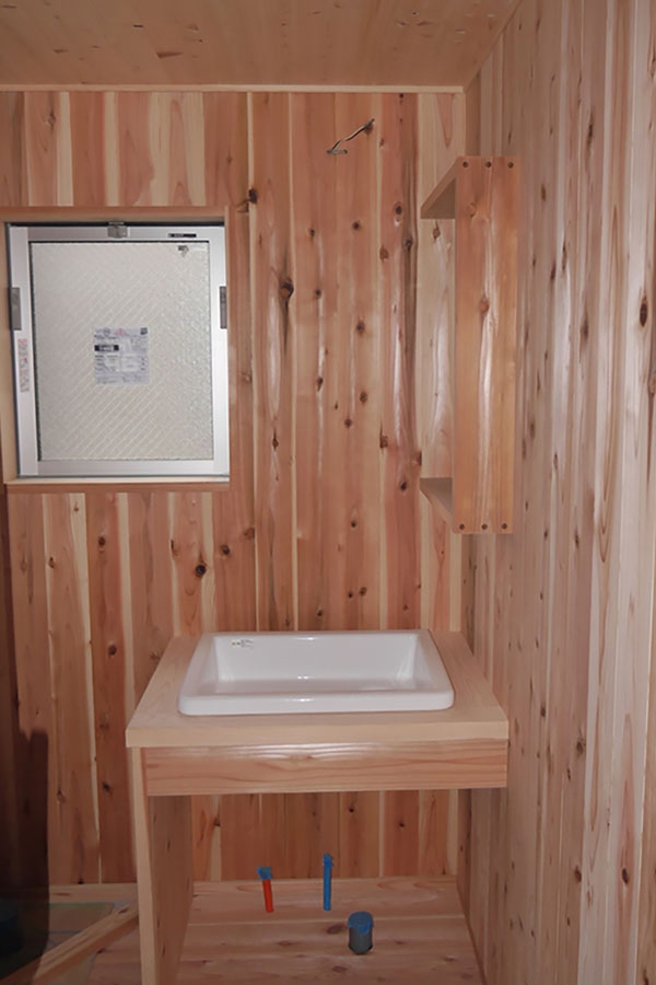 例えばこの洗面台。建具屋さんにオーダーして材質もこった物にするのが通常なのかも……。それを家と同じ材木屋さんから材料を取り寄せて、引き出しとか扉とかは無しにして、大工さんが手作りすることでコストダウン。湿気がたまることがいやなので、はじめから湿気対策に扉無しが希望だった施主夫婦には希望通りなのです。