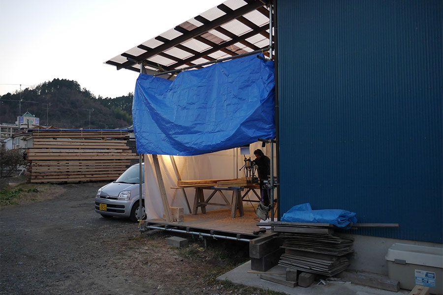 外に開いている作業小屋、寒いので皆さん厚着です。