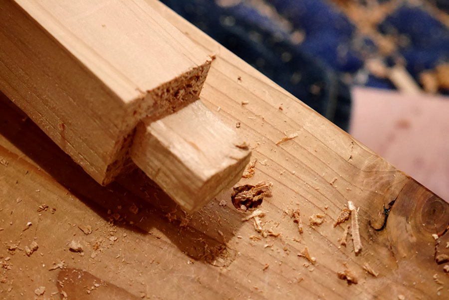 右側の写真はIKEAで買った一番安いトイレットペーパーフォルダ。格安なのに取り付けてみると杉の板壁にマッチしそうでちょうど良く、同じ仕様のタオル掛けとあわせて使うことにしました。これをトイレに座って左側の洗面台の横につけると、ちょっとデブの僕には腰をひねるのがきついので、右側に洗濯機を隠しを兼ねて衝立を本実継ぎの檜板で作ってみました。ほぞとほぞ穴を刻んむのは勿論、衝立を作るのも初めてなので、どんなものが出来るのか心配ですが、頑張ってやってみました。