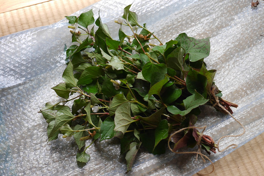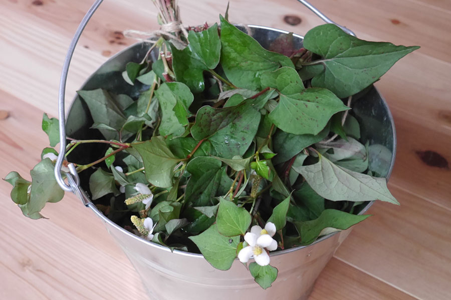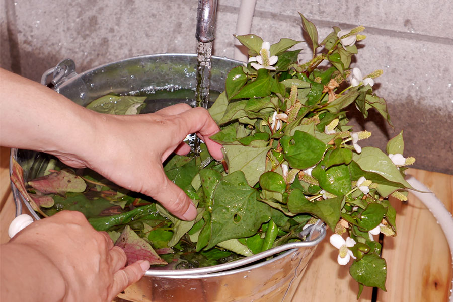 ドクダミは白い花が咲いている頃が一番薬効が高いとされています。その頃に摘んだら、すぐに念入りに水洗い。