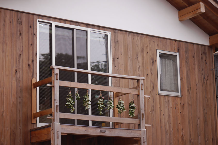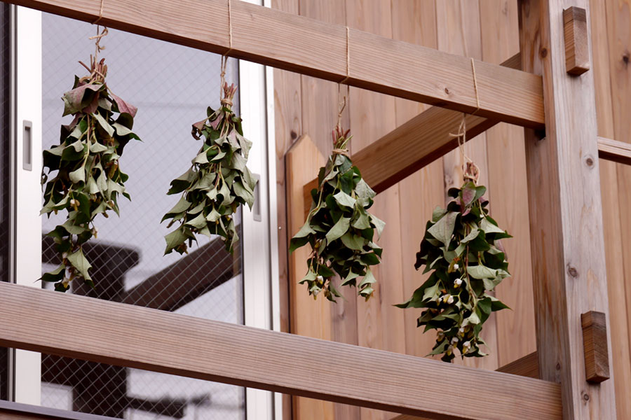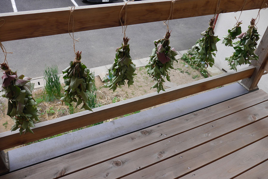 水洗いしたら、水気をふいてブーケのように束にして、風通しのよい半日陰につるしておきます。人によっては水気を取る程度にさっと干して、すぐにホワイトリカーにつける方もいますが、今回はまる2日程干します。