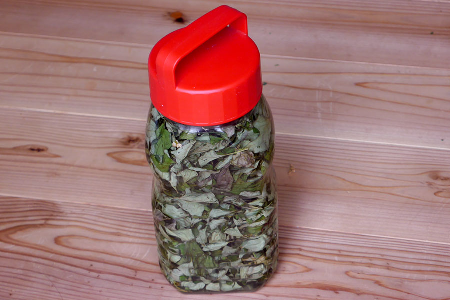 干したドクダミは、葉っぱだけを摘み取って、度数の高いウォッカや焼酎で殺菌した瓶につめていきます。水気を飛ばしただけの生葉なら瓶の1/3くらいと参考にしたサイトでは書かれていたので、乾燥すると少し容積が減るので、1/4ぐらいで良いと思います。出来上がってから強すぎないか確かめて使ってください。