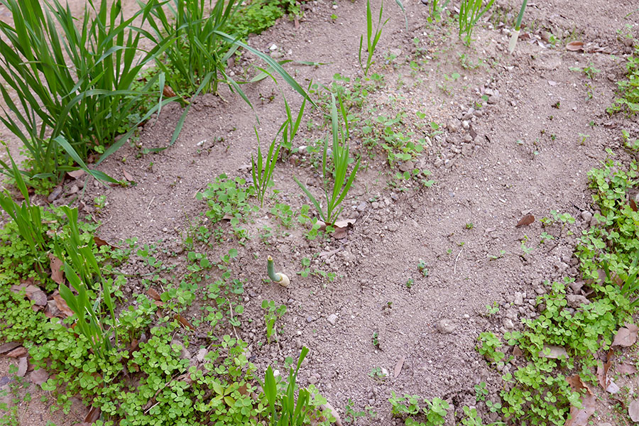 我が家の畑は4つのエリアに区切ります。一坪菜園なのでちょうど畳半分が1エリア。キュウリエリアは縦に三等分、左右のスペースはちょっと低めのラディッシュゾーン。穴を掘って完熟堆肥をひと掴み入れ鞍付きを施した真ん中の小高い畝はキュウリゾーンに……。キュウリの種と一緒にスーパーで買った九条ネギの残った根を植えました。隣のトマトエリアとの境に九条ネギの種もまいてあります。