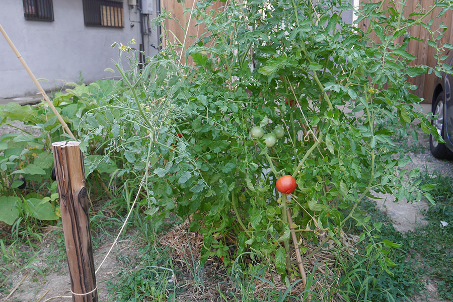 放っておけば育つのではなく、毎日観察して、水はやった方がいいのか、悪いのか、肥料は本当にやらなくていいのか、それとも少しはやるのか……。草は刈るのか、放っておくのか、等など、毎日のように考えなければならない事だらけ。手探りの園芸作業です。草は元気なうちに刈り取って、トマトや茄子の幹のまわりにかぶせると、本当に土が乾きにくくなり、新しい草が生えにくく、虫にもやられにくいのが分かりました。これを忘れて、3本植えたキュウリが1本だけに……。しかも生き残ったのは適当に植えた補欠組。余った苗だったのです。