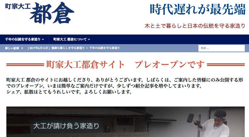 「伝統的な古民家のような土壁の家を建てたい!」そう願ってはじめた我が家の家造り、その願いを実現してくださった都倉孝治棟梁が立ち上げ、お弟子さんたちと研鑽を続けておられる、町家大工都倉のホームページが8月6日(日)オープンいたしました。アドレスは下記の通りです(どちらも同じサイトです)。
